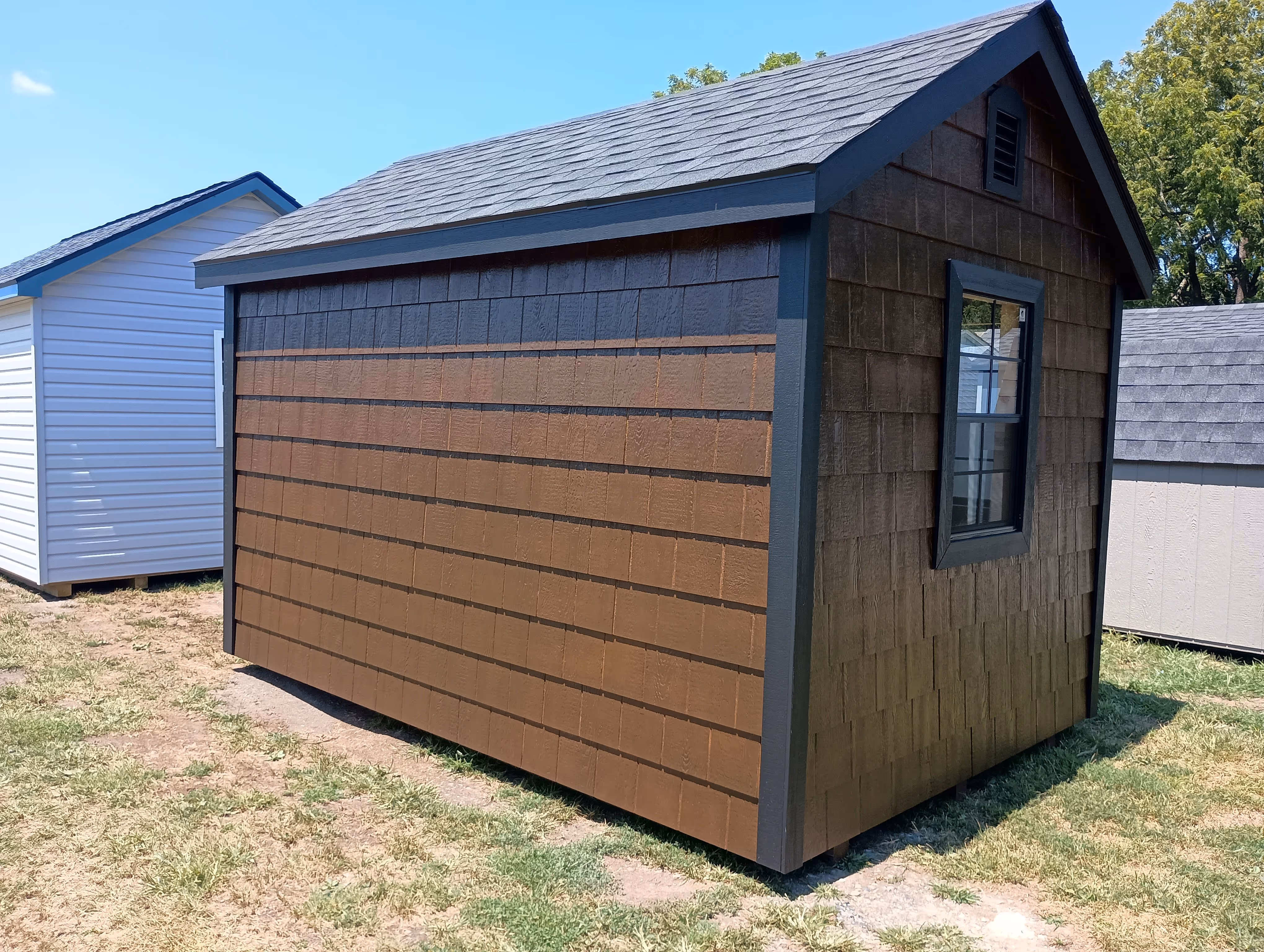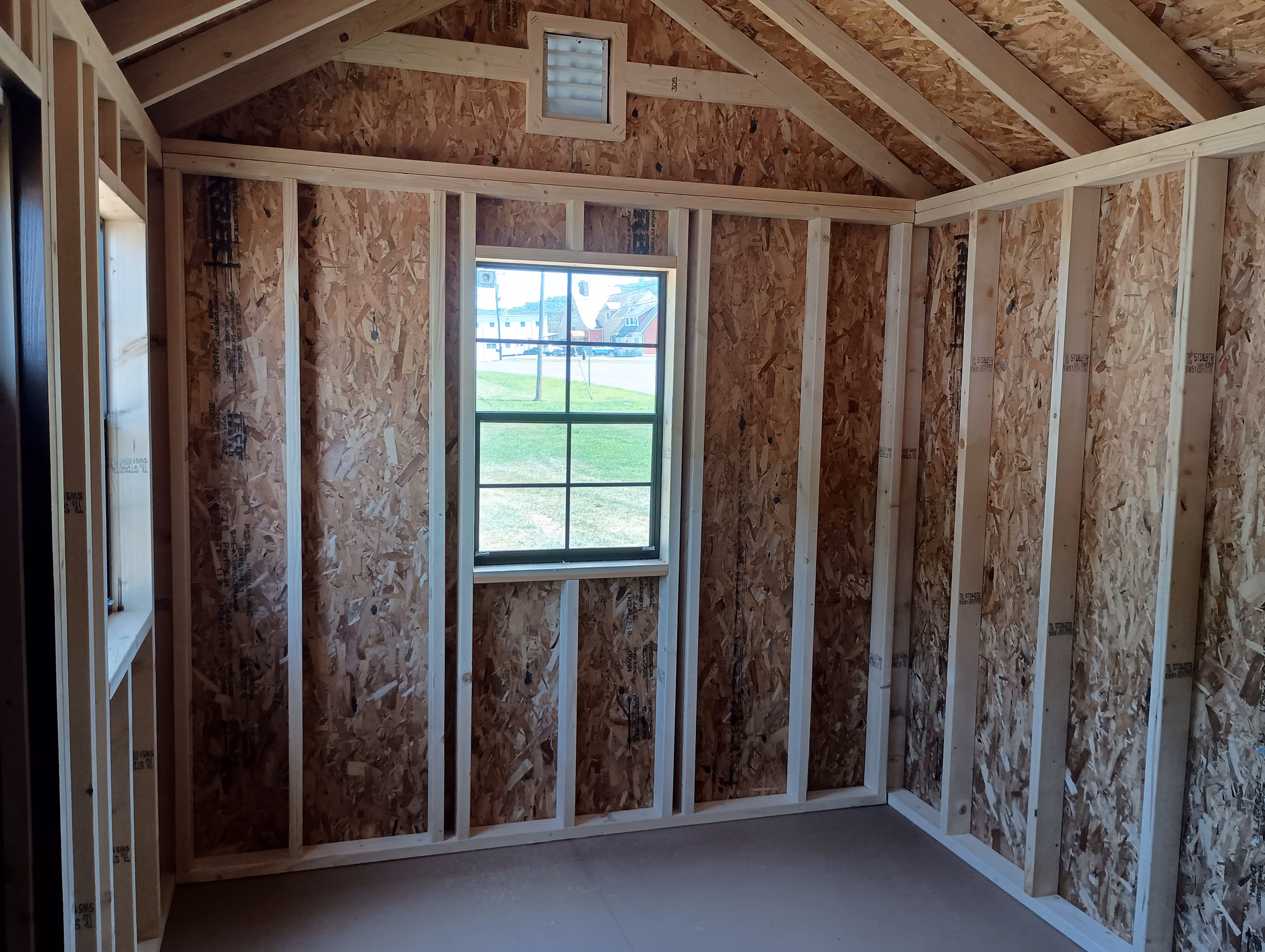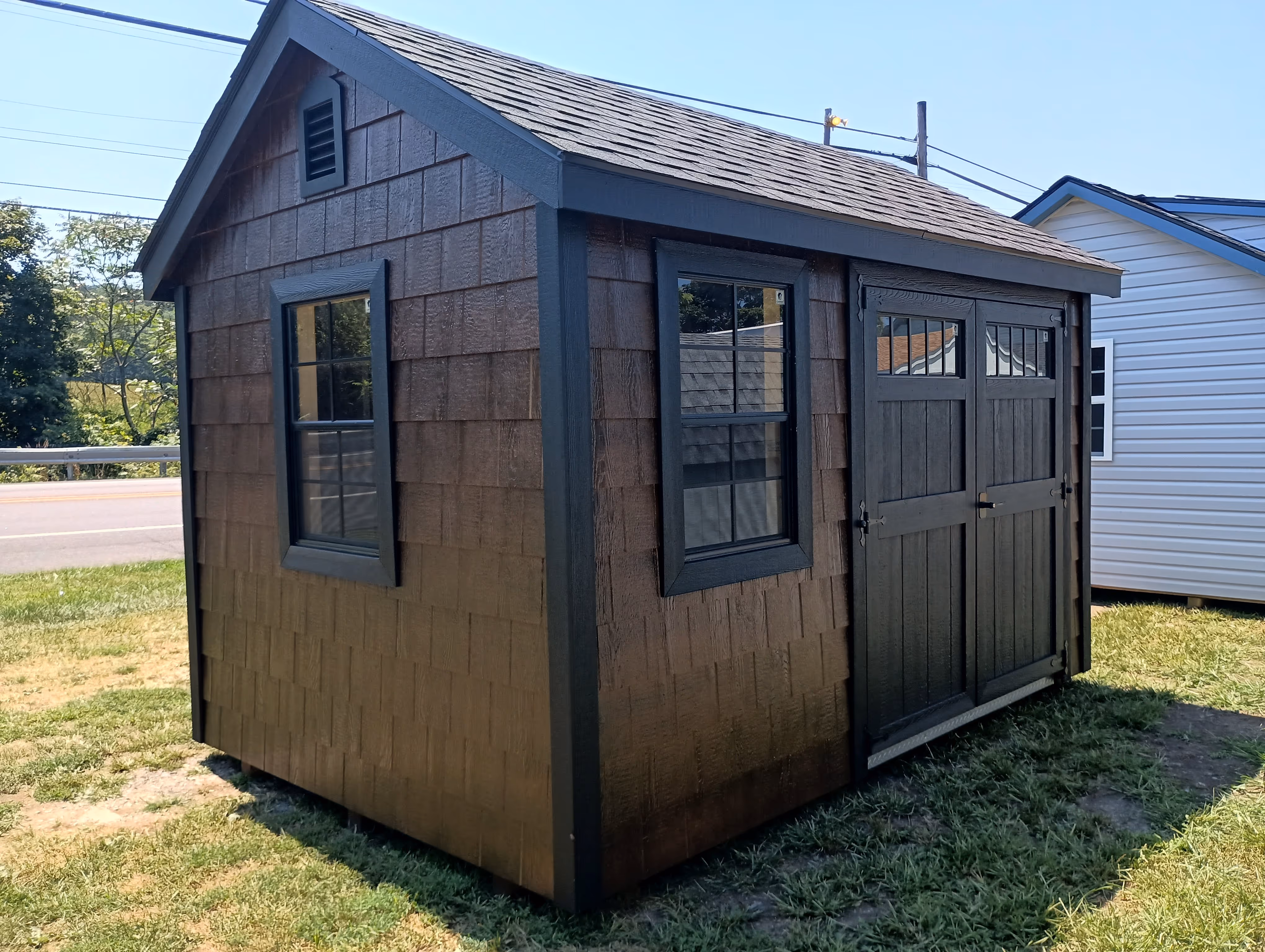 Includes:+ LP Faux Cedar Shake Siding (Glossy Mushroom)+ 30 Year ARC Shingle (Black)+ Trim (Black)+ 2x4 Framing 16" O.C.+ 4x4 PT Runners+ LP Smart Floor+ (1) 6' Double Door with Transom Windows+ (2) 24x36 Windows+ (2) Regular End Vents
