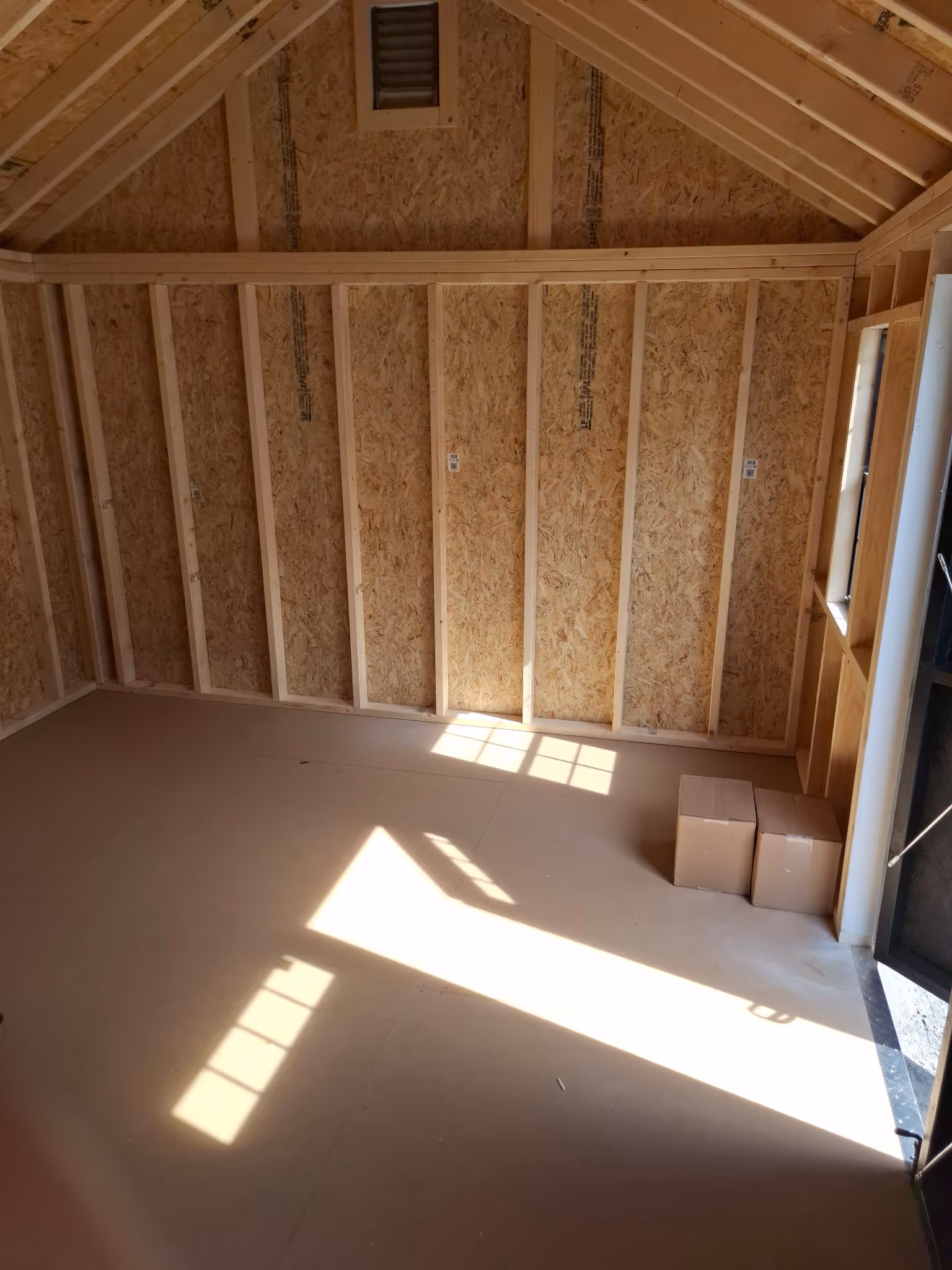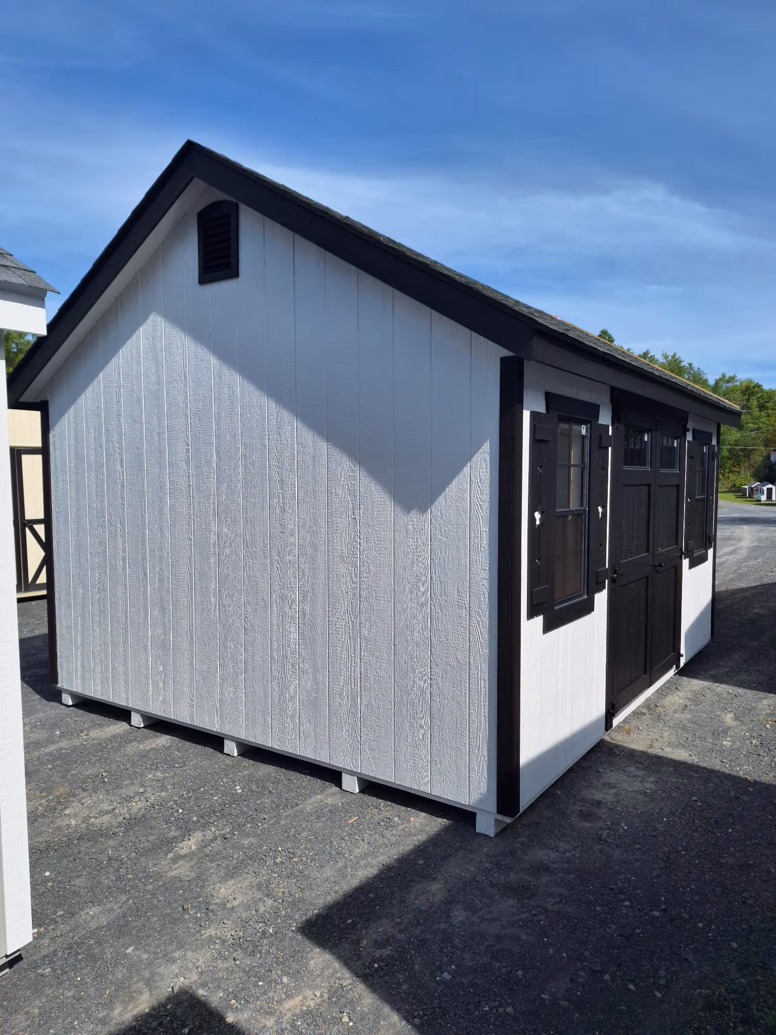 Includes:+ LP Smart Panel Siding (White)+ 30 Year ARC Shingle (Charcoal)+ Trim (Black)+ 2x4 Framing 16" O.C.+ 4x4 PT Runners+ LP Smart Floor+ (1) 6' Double Door w/ Transom Window+ (2) Windows+ Shutters (black)+ (2) Regular End Vents