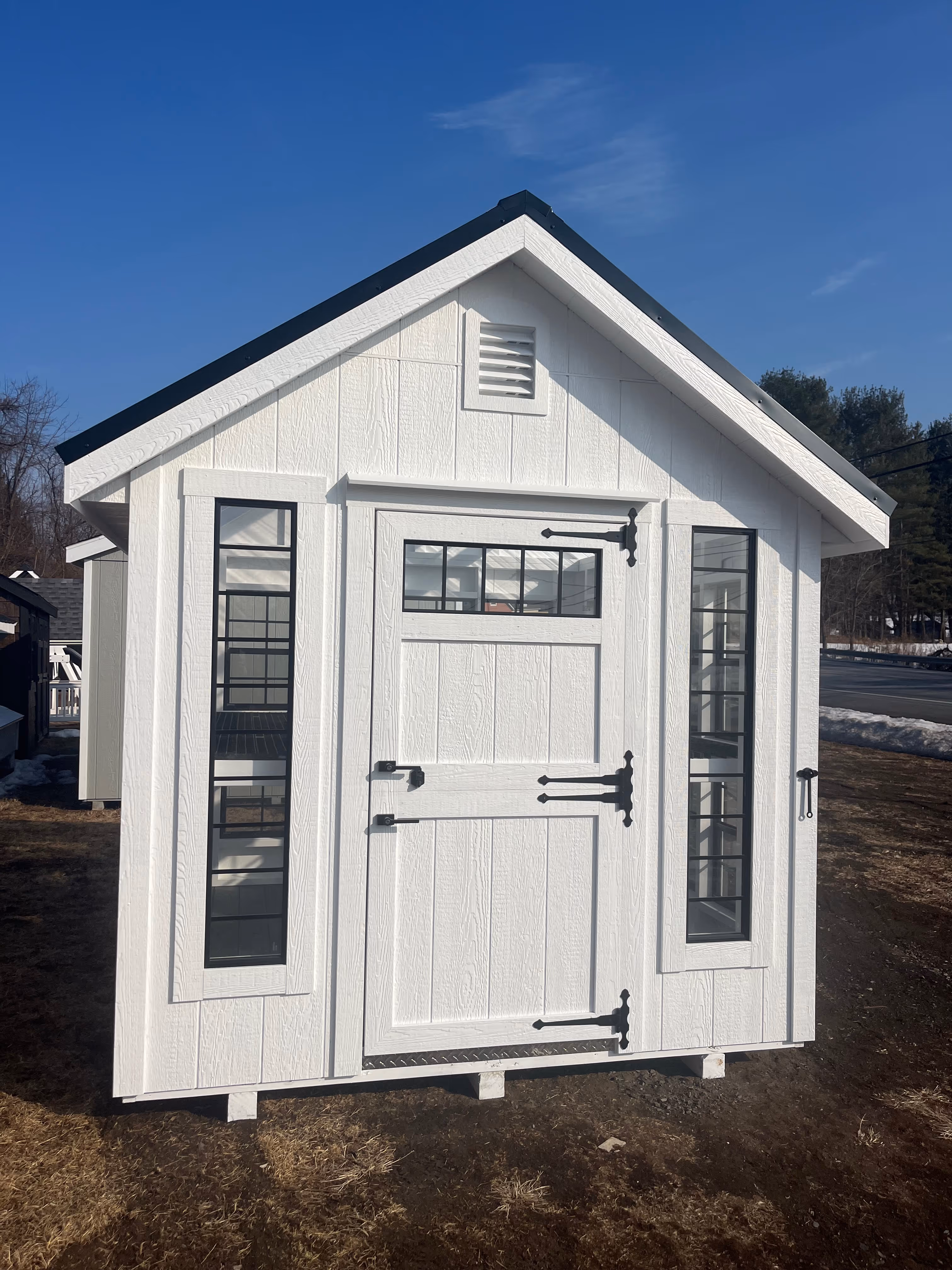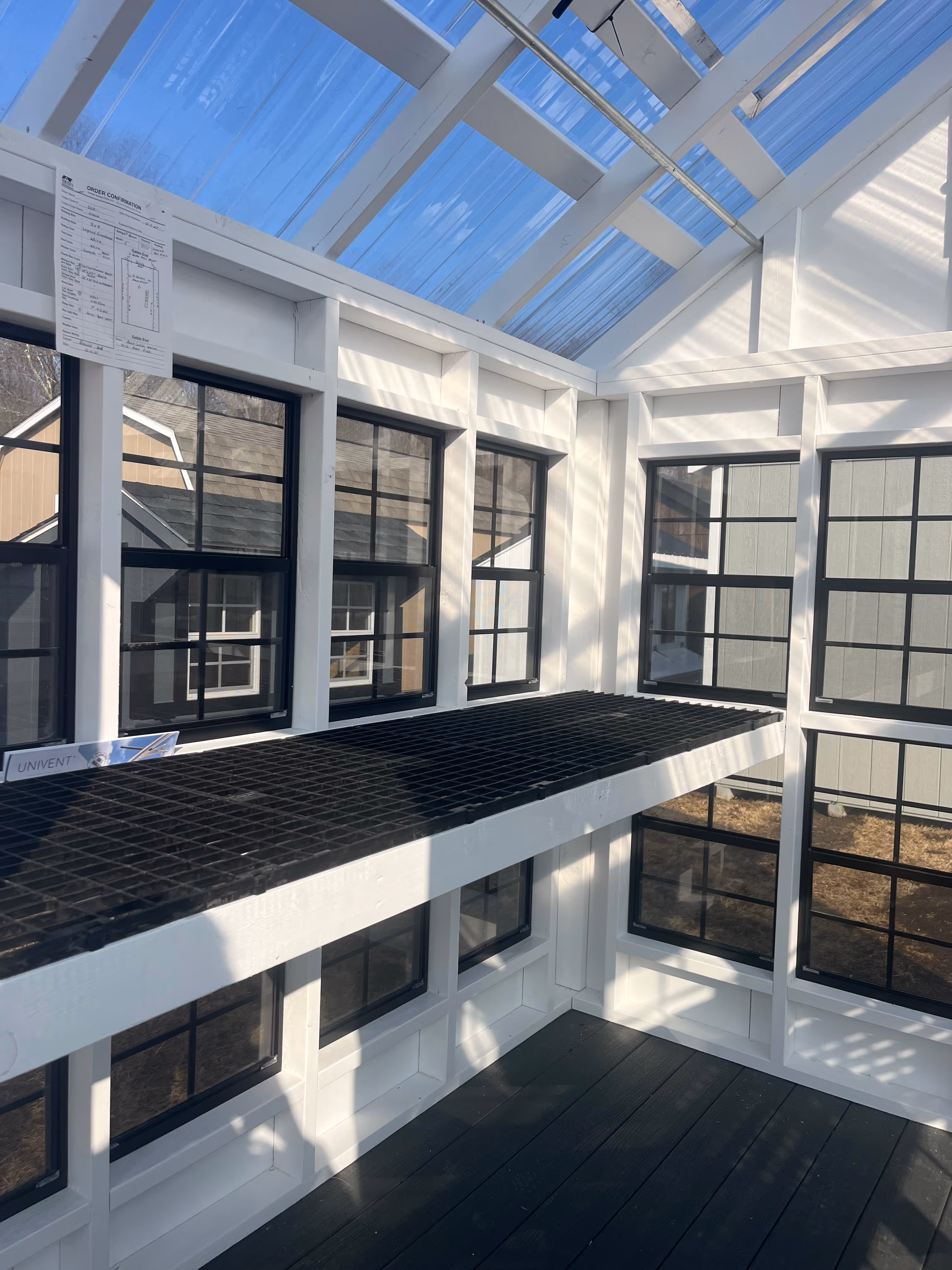 Includes:+LP Smart Siding(White)+White Trim+Clear Suntuff Skylight Roof+2 End Vents w/Inside Doors+Auto Roof Vent+3' Transom Dutch Door+Double 18x27 Stack Windows+24" Lifetime Benching+Trex Flooring+2x4 Framing 16" OC+PT Runners