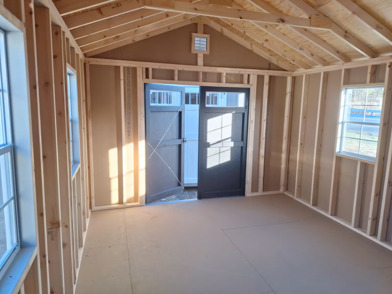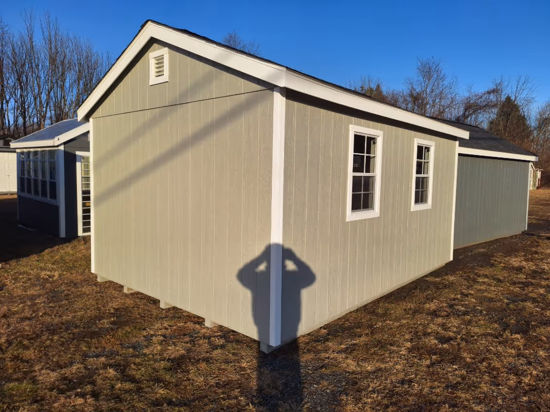 Includes:+LP Smart Siding(Zook Gray), +White Trim, +30 YR ARC Shingles(Dual Black), +4 Shed Windows, +6' Double Door w/Transom Windows, +Ridge Vent, +2 End Vents, +2x4 Framing 16" OC & 12" OC Floor Joist, +4x4 PT Runners