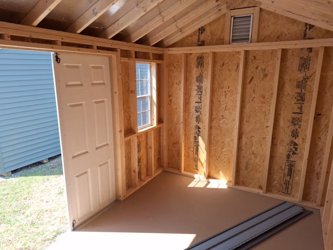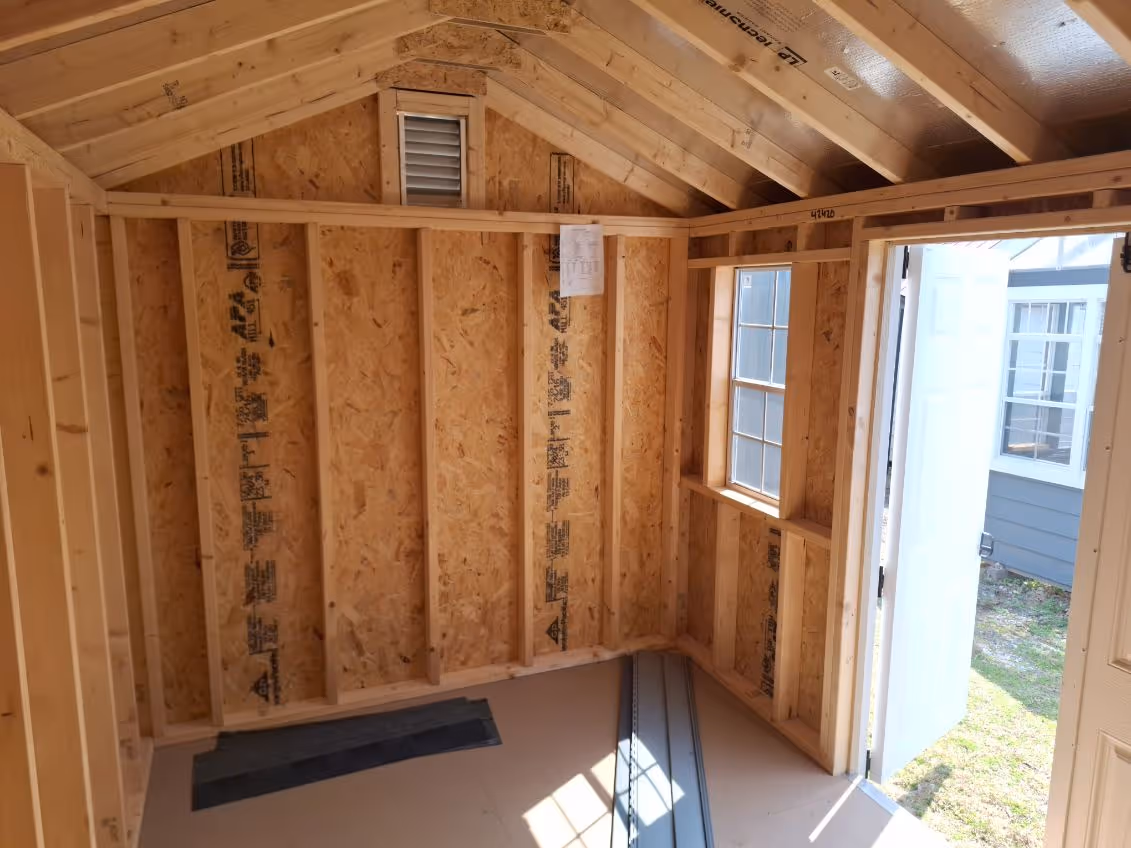 Includes:+Lifetime vinyl Siding(Alpine Forest), +White Trim, +30 YR ARC Shingles(Charcoal), +LP Tech Shield Roof Sheathing, +2 Deluxe Vents, +(2) 18x27 Shed Windows, +4' Double Door, +2x4 Framing 16" OC Walls & Ceiling, +LP Smart Flooring, +12" OC Floor Joist, +4x4 PT Runners