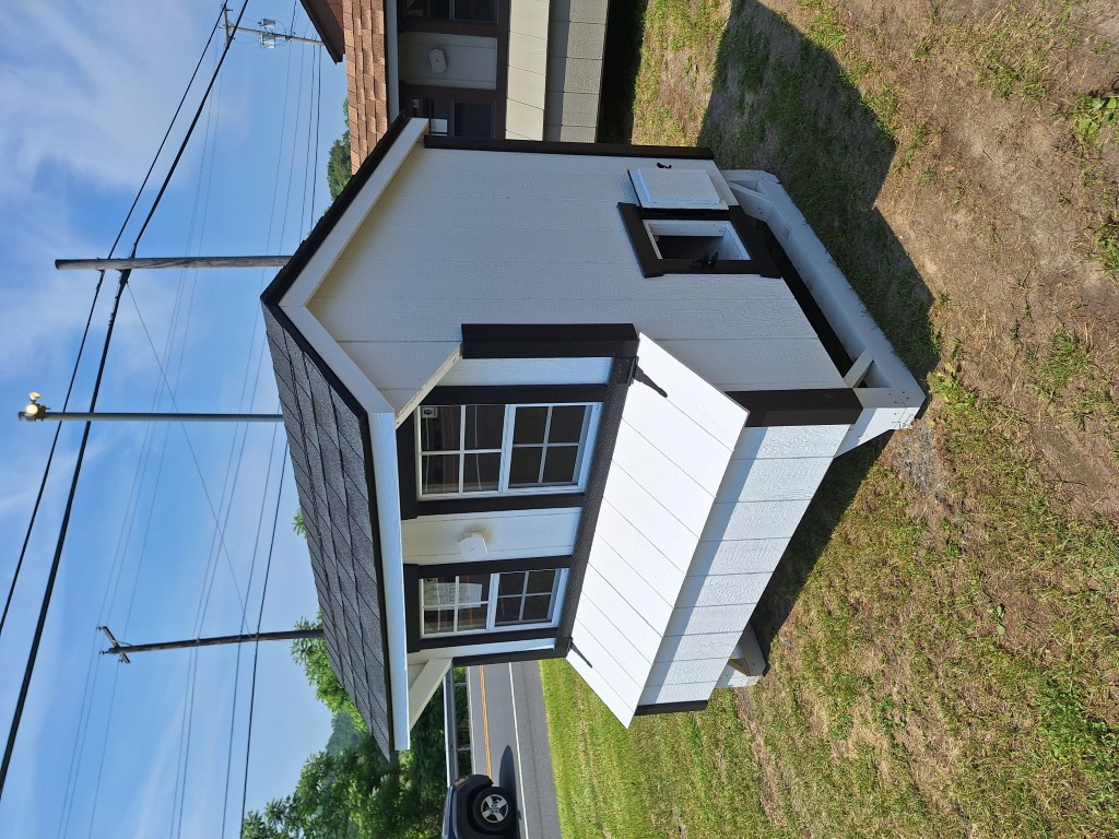 Includes: + LP Smart Siding (White) + Trim (Black) + 30 Yr ARC Shingles (Charcoal) + LP Smart Flooring + Chicken Door w/ Ramp + Roosting Bars + 2 Windows + Man Door + 4 Nesting Boxes + Venting Hatch