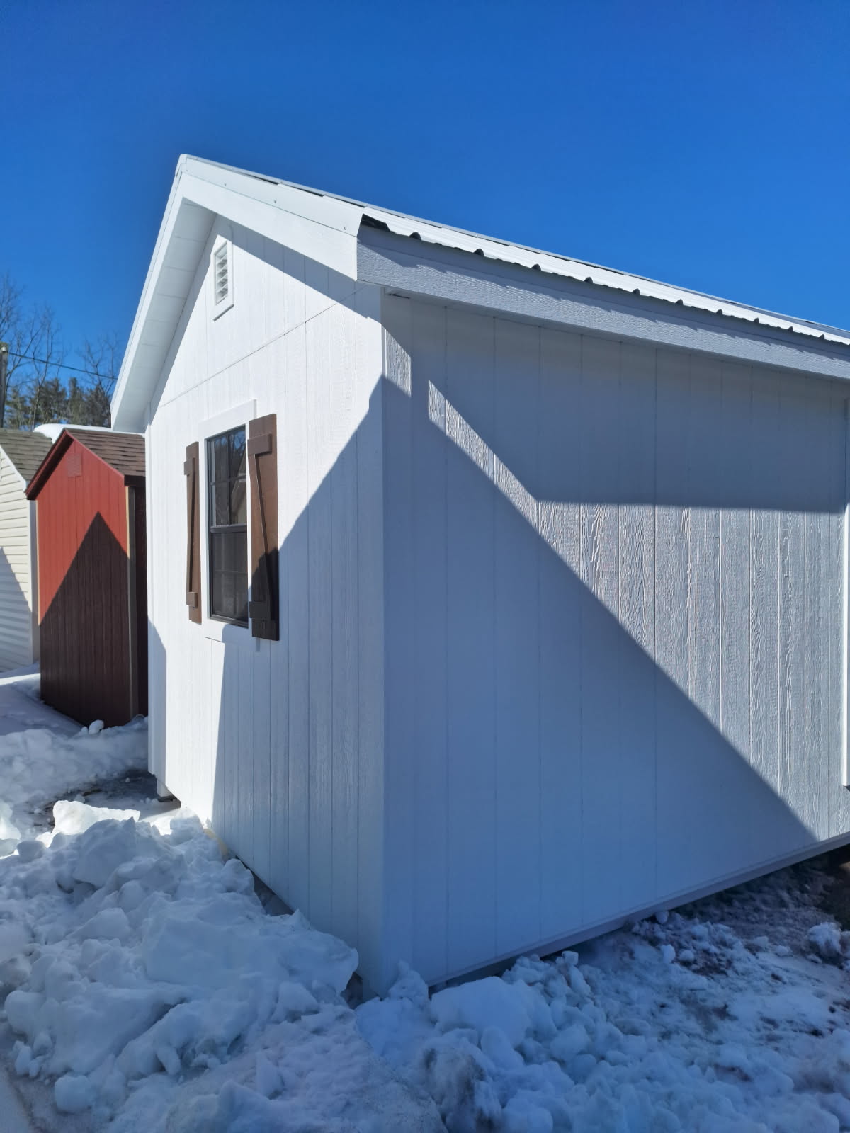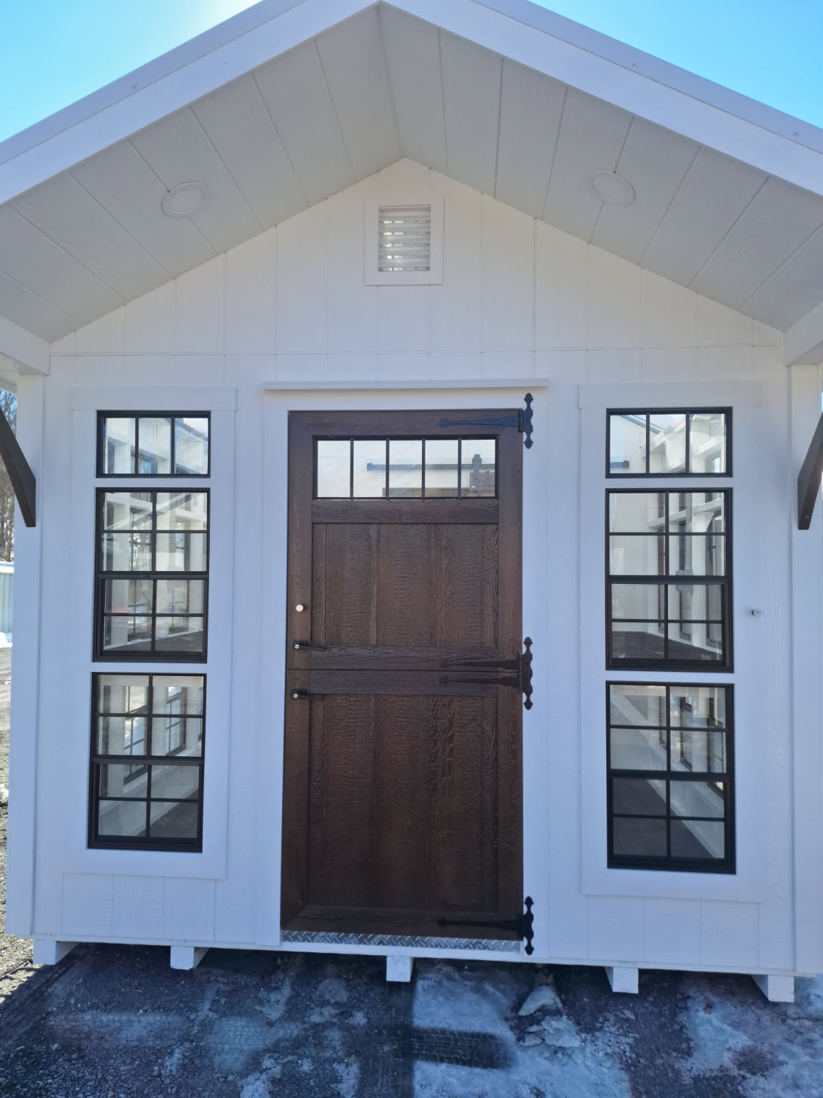 Includes:+LP Smart Siding(White), +White Trim, +Clear Suntuff Skylight Roof, +2 End Vents, +3' Transom Dutch Door, +6' Transom Double Door, (1) 18x27 Shed Window w/Shutter, Triple Stack Windows w/Transom Windows, + 2x4 Framing 16" OC, +4x4 PT Runners