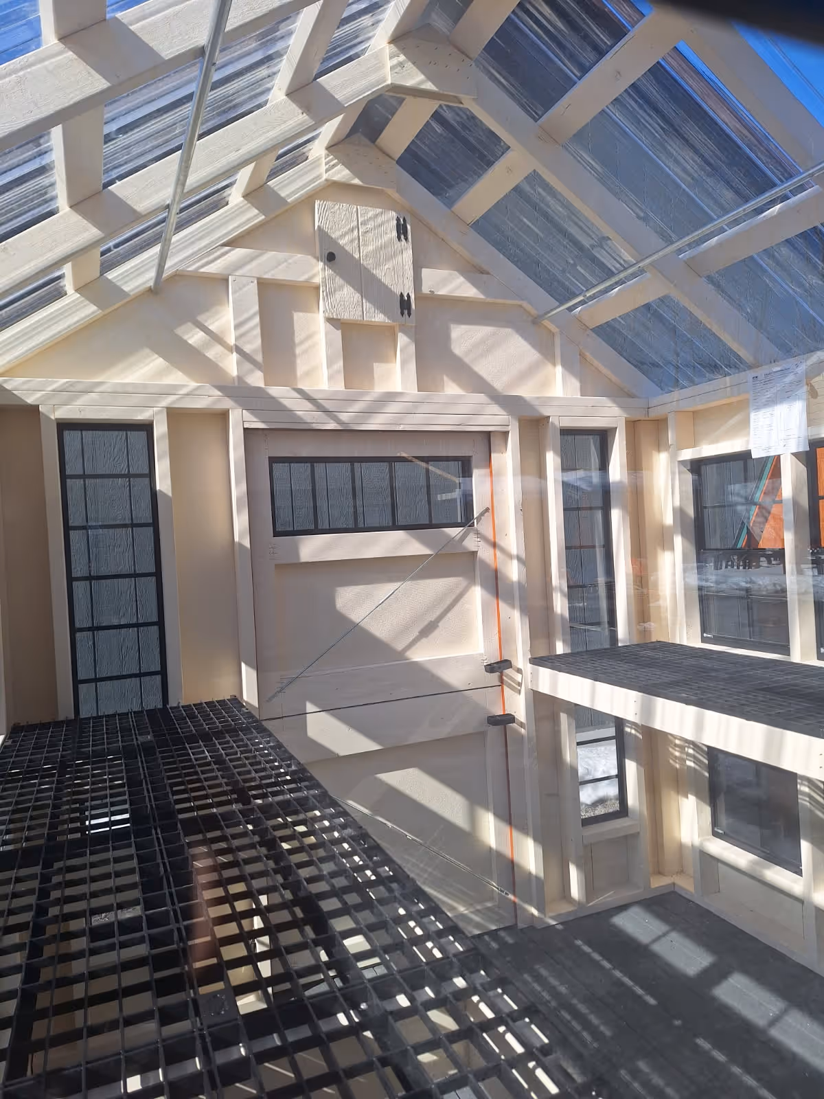 Includes:+ LP Smart Siding(Mahogany)+ Black Trim+ Clear Suntuff Skylight Roof+ 2 End vents w/inside doors+ 3' Transom Dutch Door+ 24" Deep Lifetime Benching+ 2x4 Framing 16" OC+ (3) 4x4 PT Runners