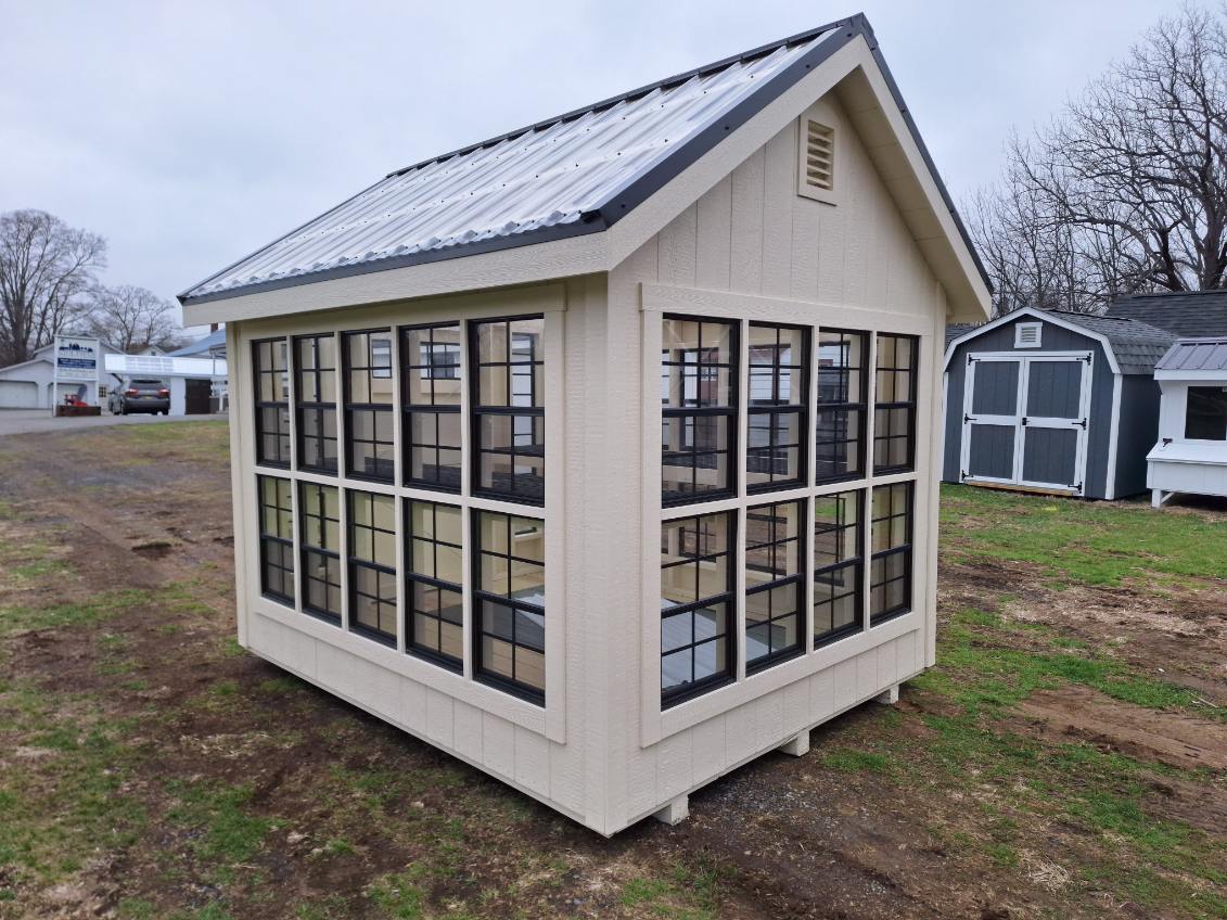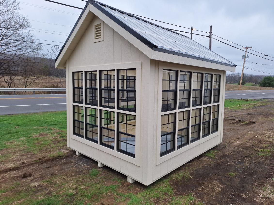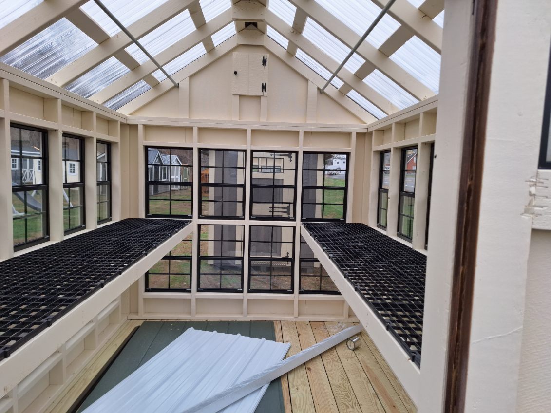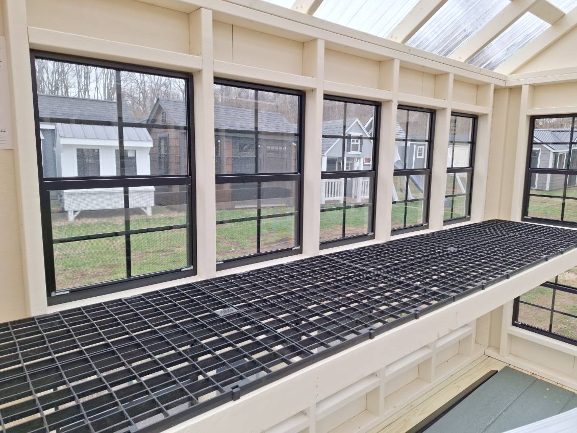 Includes:+LP Smart Siding(Navajo White), +Navajo White Trim, +Clear Suntuff Skylight Roof, +Double 18x27 Stack Windows, +(2) 72"x10 Transom Windows, +3' Transom Dutch Door(Chestnut), +P.T. Deck Boards, +24" Lifetime Benching, +2 Gable Vents w/Inside door, +2 Pipes for hanging, 4x4PT Runners